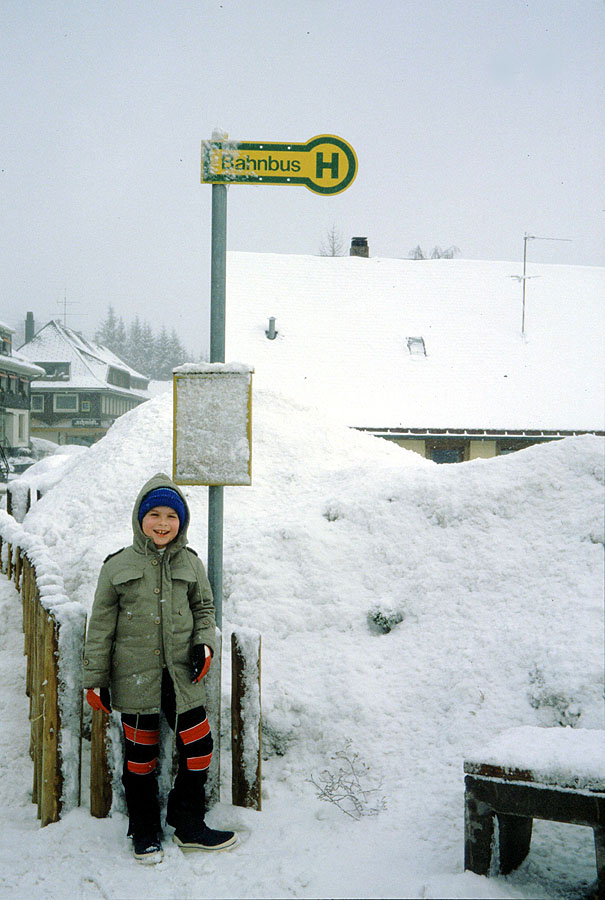 An der Bahnbushaltestelle vor der Post in der Waldshuter Straße zeigt uns mein Sohn Thomas 1983 die enormen Schneemassen.