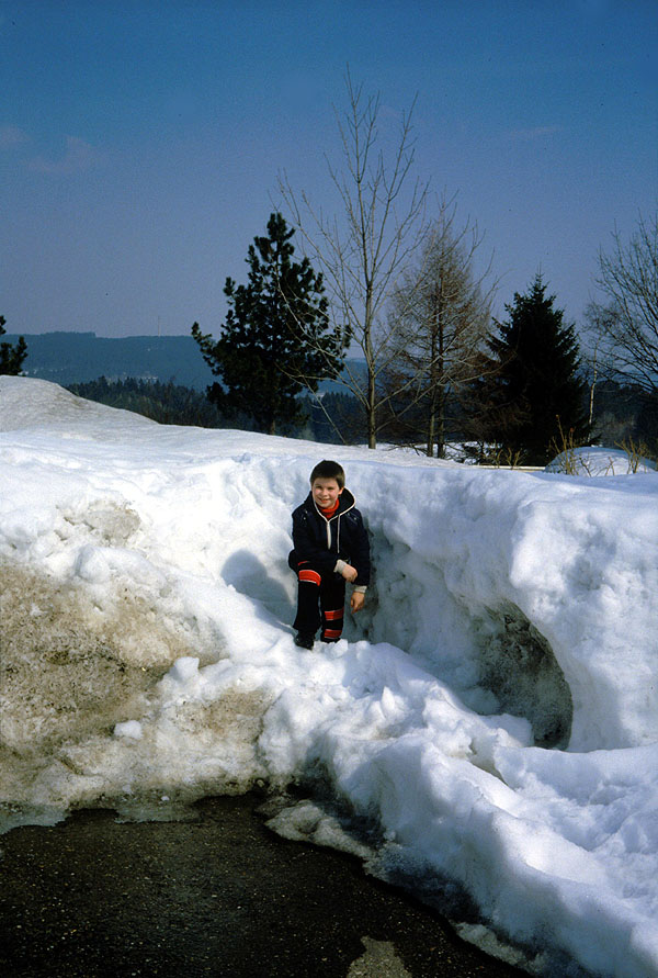 Der Parkplatz an der Tankstelle ist 1984 von einer Schneemauer eingefasst.