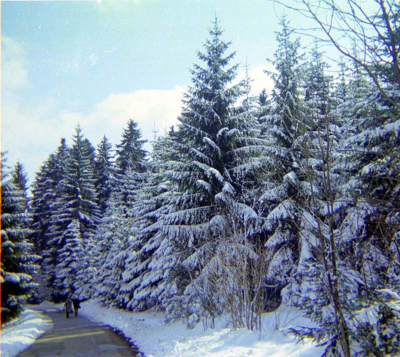 folgen einer schmalen Straße durch den verschneiten Wald bis zum Ortsschild von Höchenschwand