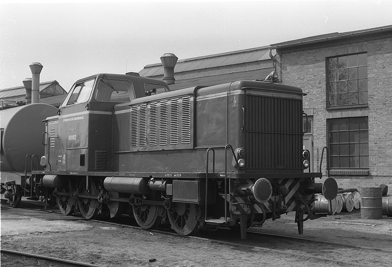 Lok 800 012 der Osthannoverschen Eisenbahnen im Bw Celle-Nord am 17.04.1980.