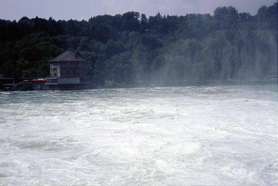 Der mit starker Strömung vorbeifließende schäumende und brodelnde Rhein zieht alle Besucher in seinen Bann.