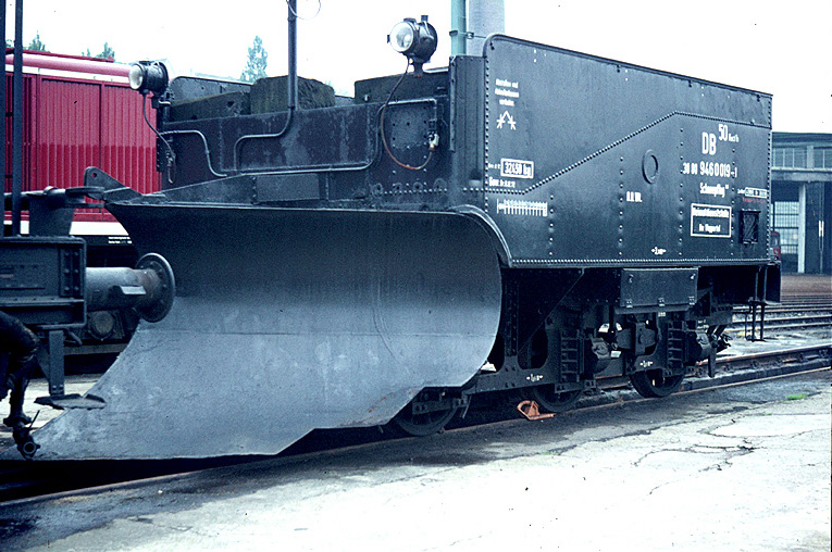 Schneepflug mit der Fahrzeugkennung 9460019 im Bw Wuppertal-Vohwinkel im Mai 1974