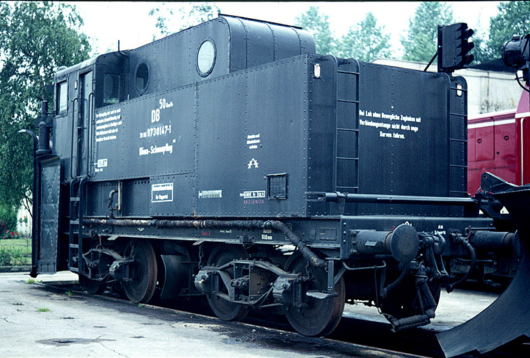 Schneepflug mit der Fahrzeugkennung 9730147 (Bauart Klima) im Bw Wuppertal-Vohwinkel im Mai 1974