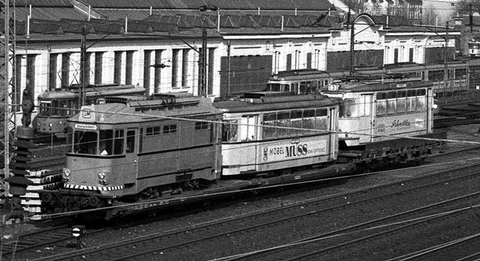 Schienenabtransport von Arbeits- und GM-Motorwagen auf Tiefladewagen der Bundesbahn am SWB-Depot Bonn-Beuel, 01.04.1978.