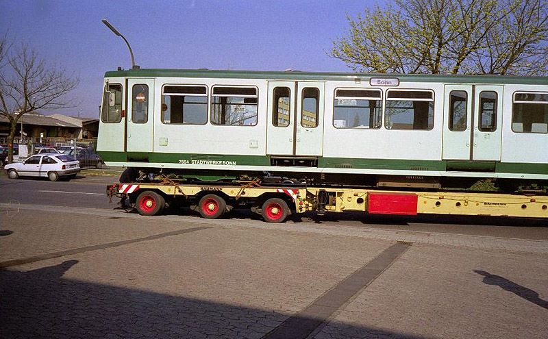 Ankunft der SWB-Bahn 7654 am 25.03.2002 an der Feuerwache Bonn-Beuel als Übungsobjekt.
