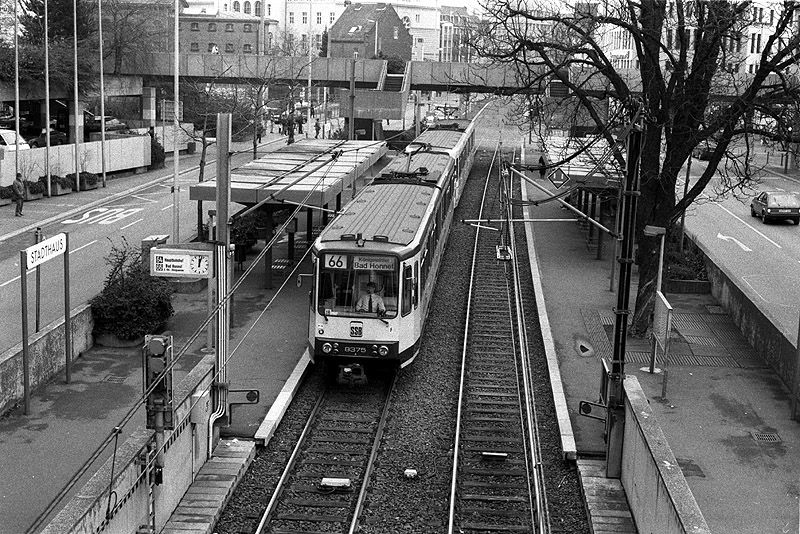 Bahn 8375 der SWB an der Haltestelle Bonn-Stadthaus am 15.01.1992.