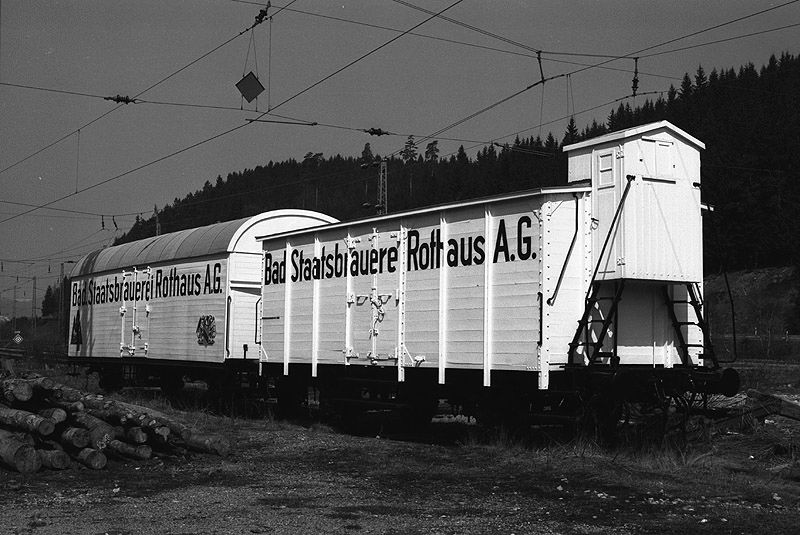 Ehemalige Kühlwagen der Rothaus-Brauerei als Denkmal im Bf. Seebrugg am 15.04.1980.
